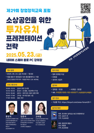 사업은 하고 싶은데, 투자자 앞에만 서면 입이 떨어지지 않는 이들을 위한 실전 세미나가 열린다.오는 5월 23일 금요일 오후 3시부터 6시까지 서울 종로에 위치한 네이버 스퀘어 PC 강의장에서 ‘제5회 한국프레젠터협회 세미나’가 개최된다. 이번 세미나의 주제는 ‘소상공인을 위한 투자유치 프레젠테이션 전략’으로, 투자 유치에 어려움을 겪는 소상공인과 예비창업자를 위한 맞춤형 프로그램으로 준비됐다.행사는 (사)창업창직교육협회와 (사)한국프레젠터협회가 공동 주최하며, 이론보다는 실전에 초점을 맞춘 강연과 실습으로 구성됐다. 발표가 익숙하