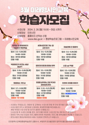 인천광역시교육청평생학습관(관장 유병식)은 인천시민을 대상으로 ‘3월 미래형 시민교육’ 학습자를 26일부터 선착순 모집한다.3월 미래형 시민교육은 ▶세계 고전문학을 통해 인류의 정신적 발자취를 알아보는 「세계시민으로 가는길, 고전읽기」 ▶생성형 인공지능의 원리를 이해하고 다양한 분야의 창작물을 만들어 보는 「빅데이터가 이끄는 세상 챗 GPT」 ▶인천의 자연환경과 깃대종을 이해해 보는 프로그램 「인천의 깃대종 알아보기」 등 총 9개 프로그램을 운영한다.2월 26일 오전 10시부터 평생학습관 홈페이지에서 선착순으로 접수하며, 교육 내용과