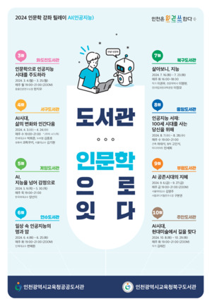 인천광역시교육청(교육감 도성훈) 소속 8개 공공도서관은 일상에서 인문학을 접하는 기회를 제공하고 시민의 인문학적 역량 강화 및 읽걷쓰 시민문화운동 확대를 위해 오는 10월까지 도서관별로 ‘인문학 강좌 릴레이’를 운영한다. 올해 인문학 강좌 릴레이 주제는 인공지능으로, 8개의 다채로운 세부 주제로 강좌를 운영한다. 세부 일정은 ▶3월 화도진도서관 ‘인문학으로 인공지능 시대를 주도하라’ ▶4월 서구도서관 ‘AI시대, 삶의 변화와 인간다움’ ▶5월 계양도서관 ‘AI, 지능을 넘어 감정으로’ ▶6월 연수도서관 ‘일상 속 인공지능의 명과 암