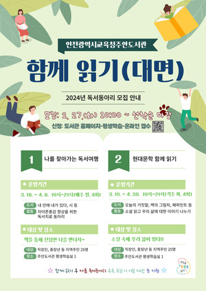 인천광역시교육청주안도서관(관장 곽미혜)은 읽걷쓰 시민문화 확산을 위해 직장인과 중장년층 등 성인을 대상으로 함께 읽기 독서동아리 참여자를 27일부터 모집한다. 함께 읽기 독서동아리는 3월 18일 독서치료 전문가와 함께 ‘내 안에 내가 있다’와 ‘현대 시’ 등 책을 통해 나에 대한 이야기를 나누고 자아존중감을 높이는 「나를 찾아가는 독서여행」으로 시작한다. 3월 19일에는 ‘오늘의 거짓말(정이현 저)’, ‘백의 그림자(황정은 저)’ 등 국내 소설을 읽고 평론가와 함께 감상을 나누는 「현대문학 함께 읽기」를 진행한다.참여 신청은 2월