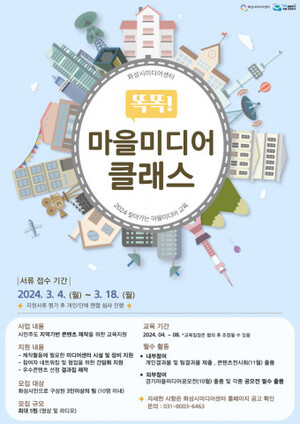화성시문화재단(대표이사 김신아) 화성시미디어센터는 오는 3월 4일(월)부터 18일(월)까지 ‘2024 찾아가는 마을미디어 교육 - 똑똑! 마을미디어 클래스’의 참여 단체를 모집한다.‘똑똑! 마을미디어 클래스’는 시민이 직접 지역의 이야기를 아카이빙하고 지역과 관련된 콘텐츠를 제작하는 ‘마을미디어활동가’를 양성하는 교육지원 사업이다.이번 교육에서는 총 5개 팀을 모집하며, 신규 단체거나 기존 마을미디어활동가 양성과정 2회 미만 참여단체만 지원이 가능하다.선정된 단체에는 콘텐츠 제작을 위한 교육지원뿐만 아니라 제작활동에 필요한 미디어센