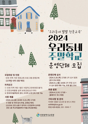 인천광역시교육청(교육감 도성훈)은 2024 권역별 마을교육지원센터 ‘주말학교’에서 전문교육 프로그램을 운영할 단체를 21일까지 모집한다.주말학교는 지역사회의 특색과 현안을 반영해 학교 교육과 상호보완적인 다채로운 전문교육 프로그램을 운영하는 사업으로 지역별 한국어 마을학당, 진로, 문화·예술, 사회참여 전문 기획·실천 프로젝트 등을 모집한다.지원을 희망하는 단체는 인천마을교육공동체(ice.go.kr) ➡ [권역별마을교육지원센터] ➡[자료실]에서 관련 자료를 내려받아 인천시교육청 학교‧마을협력과에 방문 또는 우편으로 접수하면 된다.1