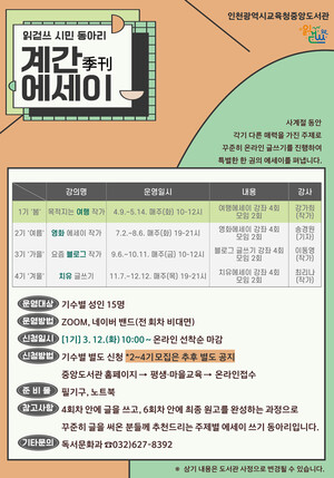 인천광역시교육청중앙도서관(관장 정경애)은 ‘목적지는 여행 작가’ 프로그램 참여자를 중앙도서관 홈페이지를 통해 12일부터 모집한다.프로그램은 사계절에 걸쳐 각기 다른 분야의 글을 써보는 ‘계간 에세이’ 동아리 사업의 일환으로, 온라인 강좌 4회와 비평 모임 2회로 운영한다. 도서관에 직접 방문하기 어려운 시민들도 글을 쓰고 책을 펴낼 수 있도록 전 회차를 온라인 과정으로 진행한다.참여 신청은 [중앙도서관 홈페이지(lib.ice.go.kr/jungang)]-[평생‧마을교육]-[온라인 접수]에서 할 수 있고, 자세한 사항은 독서문화과(☎