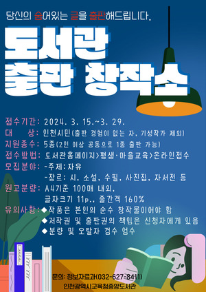 인천광역시교육청중앙도서관(관장 정경애)은 작가가 되고 싶은 꿈이 있거나, 자신의 인생을 회고한 원고가 있음에도 출판의 기회가 없어 발간하지 못한 인천시민을 대상으로 원고를 모집해 책으로 출판하는 「도서관 출판 창작소」를 운영한다고 15일 밝혔다.도서관 출판 창작소는 공공도서관 거점 읽걷쓰 사업의 30만 저자 발굴을 위해 도서관이 시민과 아마추어 작가의 작품을 출판할 수 있도록 지원하는 사업이다. 읽기와 쓰기에 특화된 공공도서관의 환경과 자원을 최대한 활용해 시민들의 책 출간을 지원하고자 마련했다.출간 예비작으로 선정된 글은 시민 저