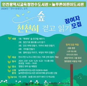 인천광역시교육청연수도서관(관장 이인우)은 늘푸른어린이도서관과 연계해 청량산 유아 숲 체험장에서 운영하는 ‘숲, 천천히 걷고 읽기’ 프로그램 참여자를 선착순으로 모집한다고 15일 밝혔다.‘숲, 천천히 걷고 읽기’는 2024년 「연수유람단」 2기 프로그램의 일환으로 연수도서관은 매해 지역 작은도서관과 함께 대표적 읽걷쓰 사업인 연수유람단을 추진하고 있다.프로그램은 계절별로 만날 수 있는 자연의 생태를 관찰하고 다양한 활동을 통해 생태 감수성을 기르고, 자연을 지키려는 마음을 가질 수 있도록 기획했다.주 내용은 ▶1회 ‘똑똑똑’ 숲 친구