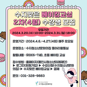 용인시청소년미래재단(이사장 이상일) 수지청소년문화의집은 3월 20일(수) 10시부터 3월 31일(일) 18시까지 ‘수지맞은 베이킹교실’ 2기를 모집한다.‘수지맞은 베이킹교실’은 베이킹에 대한 청소년들의 요구를 반영한 프로그램으로, 1기 참여자 20명을 모집해 3월 2일부터 23일까지 딸기잼, 머핀, 고구마 상투과자 등을 만드는 4회차 과정이었다.2기 참여 대상은 유아 8명, 초등 12명으로, 4월 6일부터 27일까지 △텃밭케이크 △마스카포네 치즈파운드 △초코볼 쿠키 △소시지 빵을 4회차 동안 만들어 볼 수 있다.수지청소년문화의집은