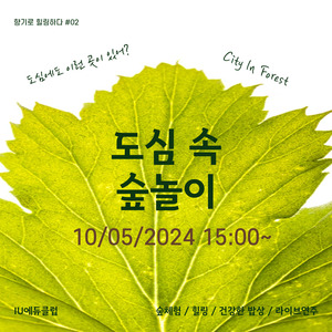 다가오는 10월 5일 15시, IU에듀클럽(대표 배윤주)이 주최하는 ‘도심 속 숲놀이’가 서울 한성대 근처 토크살롱에서 진행한다. 토크살롱(대표 최재철)은 음악과 함께 삶과 경제 이야기가 있는 성북동 한성대 입구역 4번 출구에 있는 지식나눔과 문화예술 공간이다.이번 행사는 어린이, 어른 누구나 참여 할 수 있는 도심 속 힐링 프로그램으로 지친 일상에서 숲 놀이 전문가 윤소영 대표를 초빙하여 강의와 체험 활동으로 진행한다. 숲과 주변의 풀나무 이야기, 간단하게 즐기는 자연물 놀이로 도심에서 자연물을 활용하여 뫔건강 챙기기, 스트레스
