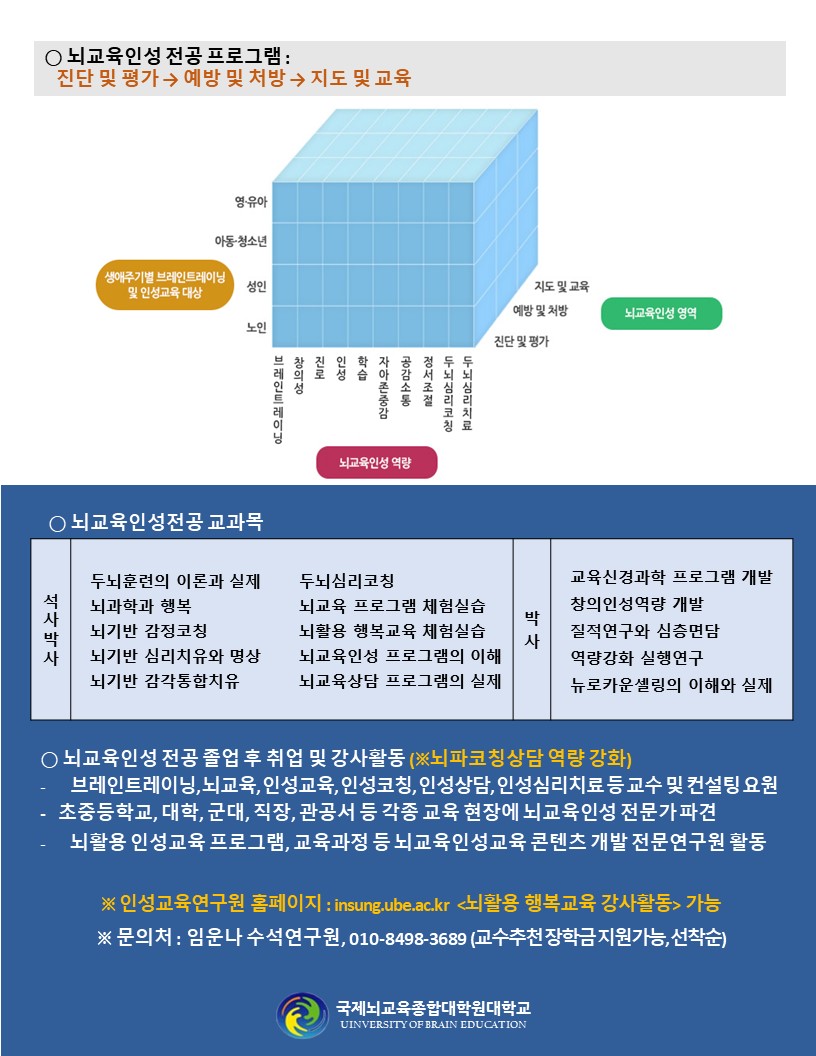 뇌교육학과는 인공지능 시대를 대비해 사회정서 역량, 회복탄력성, 정서조절, 마음챙김, 인공지능 윤리 등 다양한 인성을 바탕으로 두뇌를 계발할 수 있는 역량을 키우고자 한다. 이를 통해 학생들은 기초 뇌과학, 두뇌와 인성의 관계, 뇌활용 인성교육 원리, 인성교육 철학 등 인성교육에 필요한 기초 소양 역량을 함양하며, 뇌활용 인성교육 프로그램 개발 및 적용, 인성교육 컨설팅, 코칭 및 상담 등 인성교육 전문 실무 역량도 배양할 수 있다.
